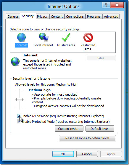 Since Internet Explorer 9 on Windows 7 64-bit, Internet Explorer has been available in both 32-bit and 64-bit versions. In Windows 8 64-bit with Internet Explorer 10, only one mode is available at one time and the outer frame runs in 64-bit mode while the tabs individually run in 32-bit mode by default. Here's how to enable 64-bit Internet Explorer on Windows 8.